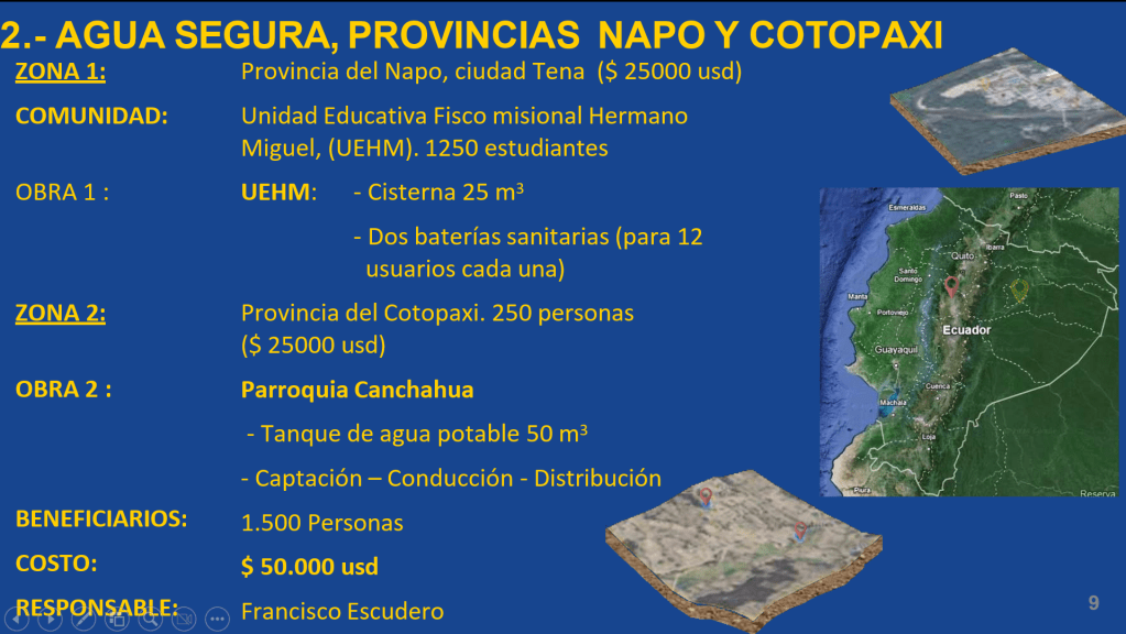 De otra parte se capacitará a los operadores y personal de mantenimiento de agua en Colegio tena y la Comunidadde Cotopaxi.