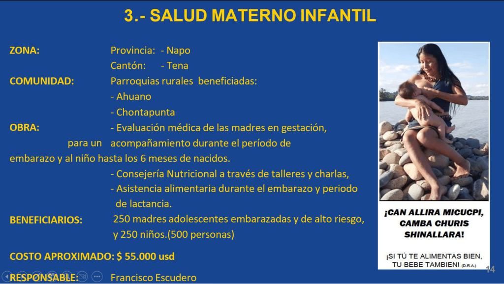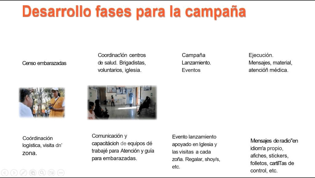 Se planea implementar una evaluación médica pediátrica y ginecológica; consejería nutricional; asistencia alimentaria; controles prenatales y de post parto; y salud Familiar. Se capacitará a las madres beneficiarias gestantes, familia de las madres embarazadas y comunidades.